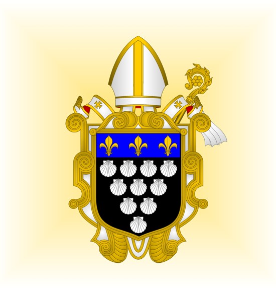 De sable, à dix coquilles d'argent (4, 3, 2 et 1), au chef cousu d'azur, chargé de trois fleurs de lys d'or.